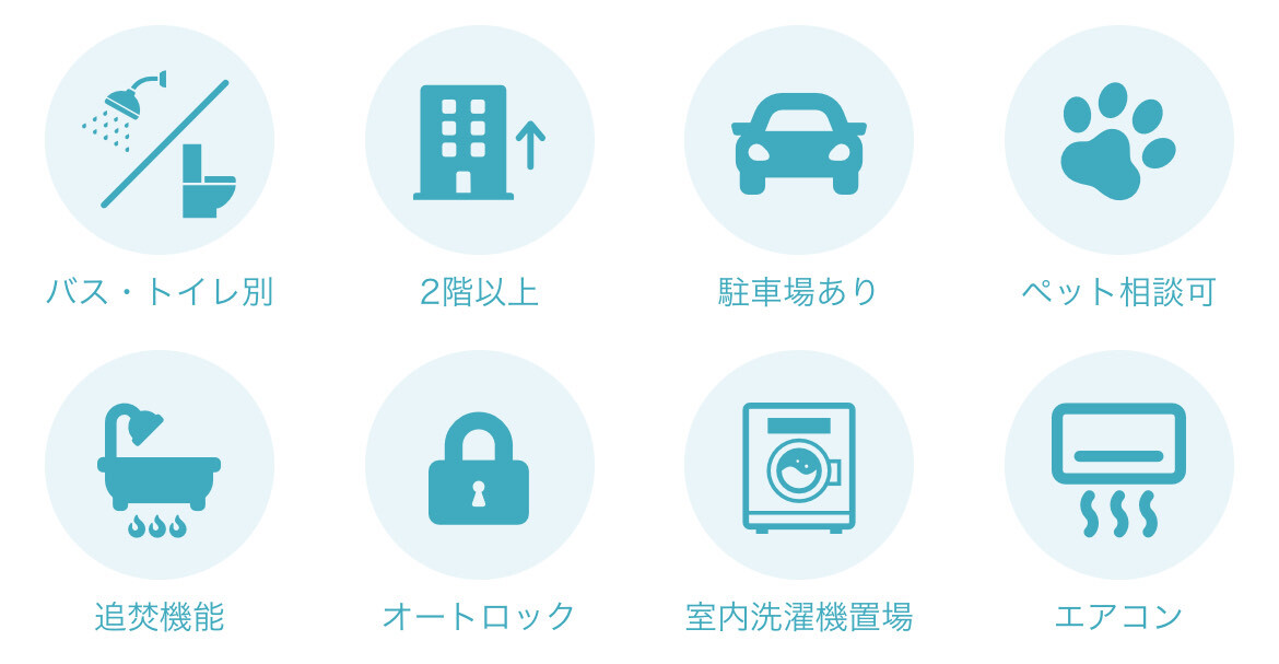 バストイレ別などの人気条件はもちろん、キッチンやバスの細かい仕様も条件として検索可能です!