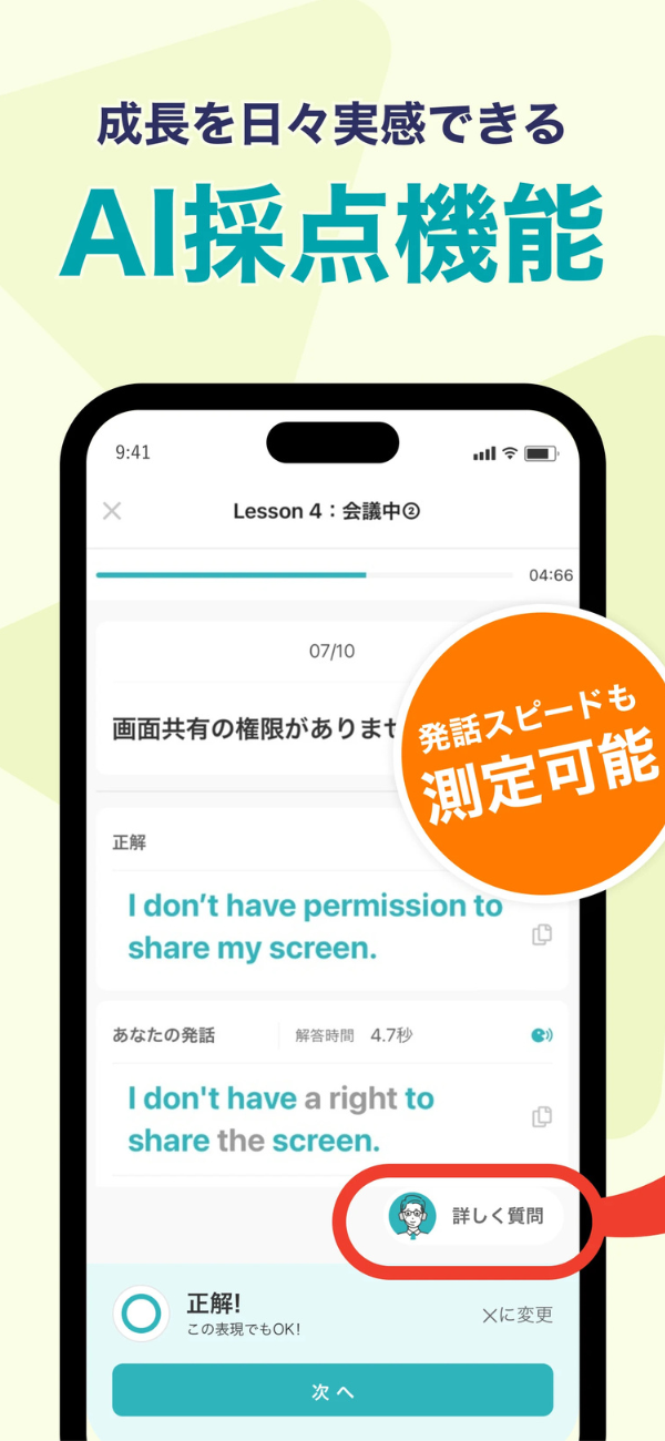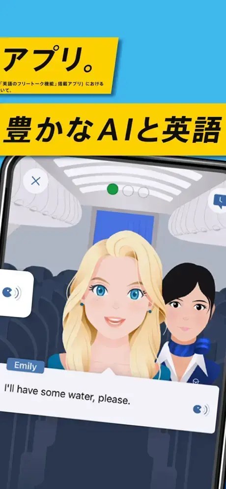 このアプリは、時間や場所を選ばず、自分のペースで英会話を学べるのが特徴で、相手はAIなので恥ずかしさもなく、間違えても大丈夫!