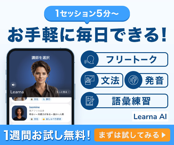 | 機能・特徴 | AIとの対話・様々なシチュエーションを想定・英語力をAIが分析・7日間で10,000語学べる・発音アドバイス |