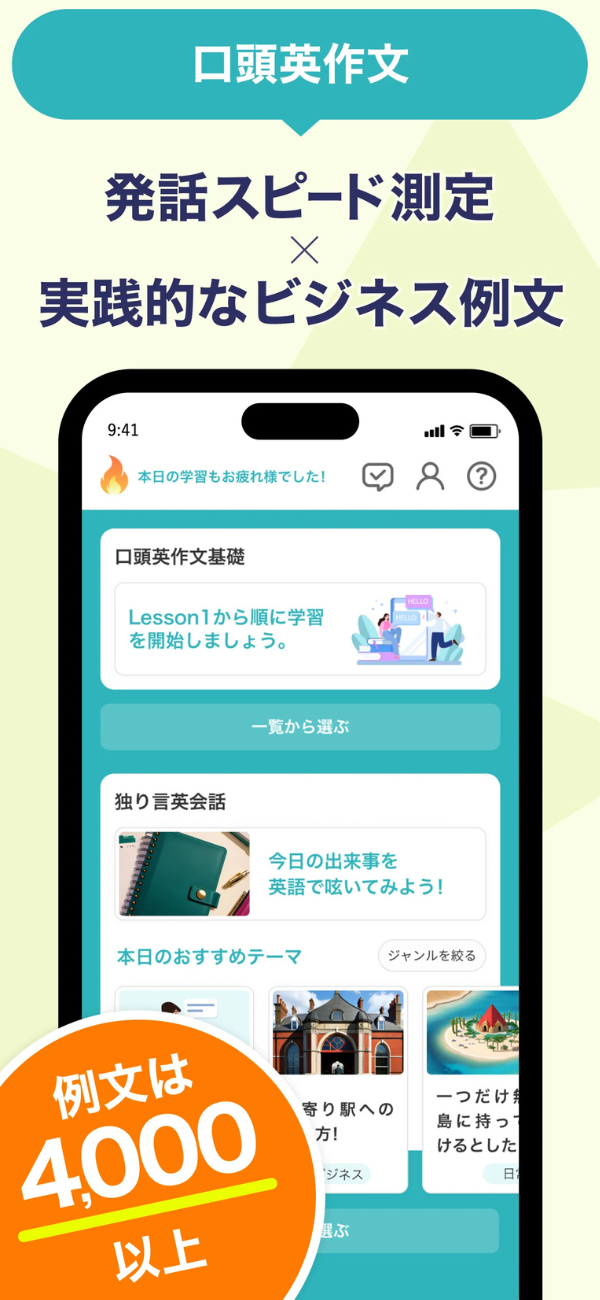 | 機能・特徴 | スピーキングに特化・インプット×アウトプットトレーニングで効率的に学習・スピード測定・そのまま使える5,000以上の例文 |