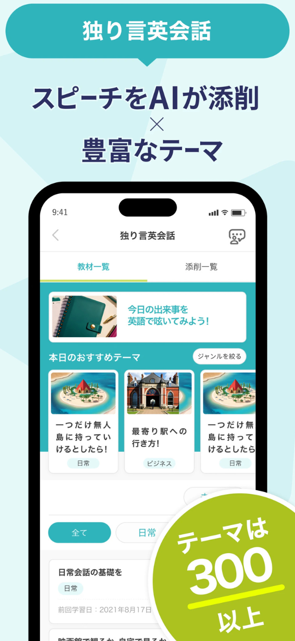 最新のAI技術と音声認識を活用し、いつでもどこでもスピーキング&リスニングのトレーニングが可能。日常英会話、ビジネス英語、時事英語など1,000以上のシーンに対応した教材で、頻出単語やフレーズもスキマ時間に効率よく学べます。